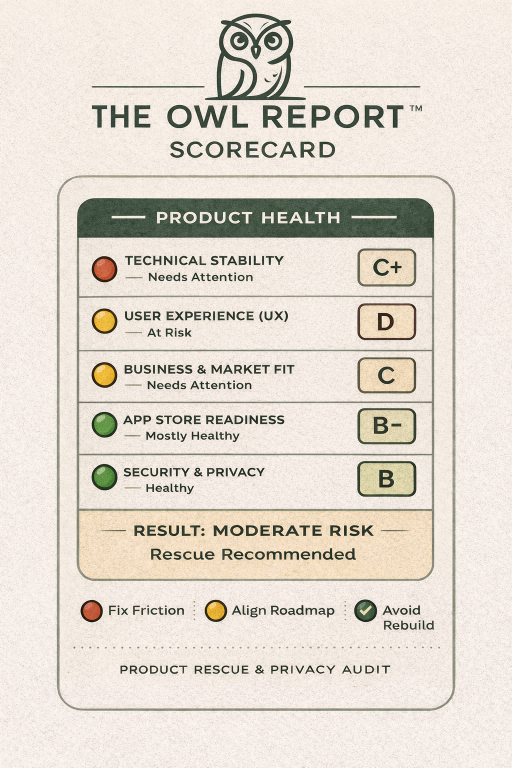 The OWL Report is a complete, structured assessment of your product’s health. It identifies hidden risks, clarifies what’s working, and provides a prioritized plan to stabilize and move forward.